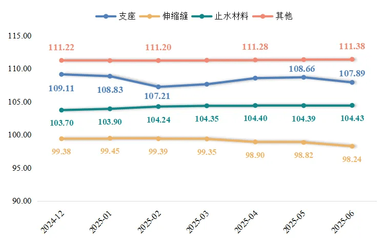 支座类产品价格指数走势与总产品价格指数类似,2月指数收于上半年低点107.21点,随后回升至5月108.66点,6月指数小幅回落,收于107.89点,较2024年12月整体下滑1.12%。从细分品类表现来看,隔震支座上半年走势较好,价格指数整体表现上扬;板型支座和球形支座价格指数波动下行,整体表现偏弱;盆形支座价格指数上半年表现相对平稳,微幅变动。