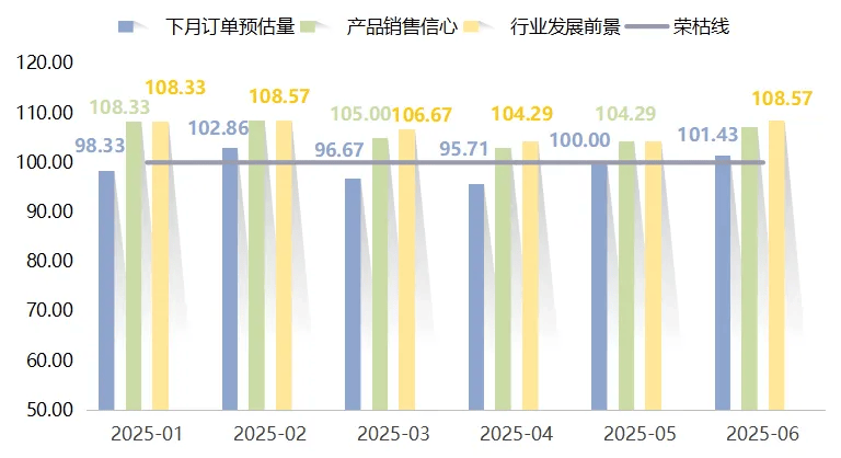 具体来看,上半年产品销售信心和行业发展前景景气指数表现良好,各月均位于荣枯线上方运行,企业对自身产品销售信心和行业发展前景持较高预期。