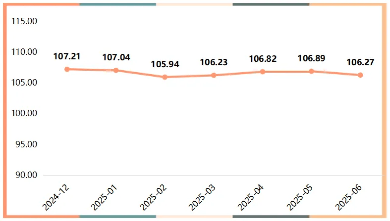 据“衡水·中国工程橡胶指数”信息系统监测,2025年上半年,衡水工程橡胶产品价格指数波动运行,整体略有下滑,6月指数收于106.27点,较2024年12月小幅下滑0.88%。