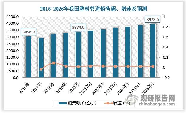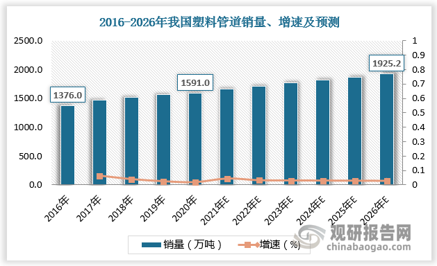 2016-2020年我国塑料管道销量由1376万吨增长至1591万吨,销售额由3058亿元增长至3374亿元。中长期,塑料管道行业仍将具有较大的市场发展空间。新型城镇化、地下综合管廊建设、海绵城市建设、城镇老旧小区改造、城市燃气管道更新改造、新基建、重大工程建设、水污染防治行动计划、乡村振兴战略规划等政府工作部署会有效促进塑料管道的推广应用,此外,“一带一路”、农业农村现代化、装配式建筑、智慧舒适家居等也会带来新的增长点。预计2026年我国塑料管道销量将达1925.2万吨,销售额达3973.6亿元。