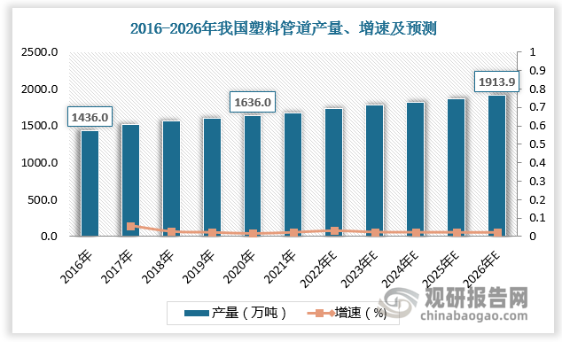 20世纪 60年代,我国开始研制生产塑料管道,主要进行技术和设备的引进、消化、研究开发以及工程试点。1999年以来,我国相继出台了《关于加强技术创新,推进化学建 材产业化的若干意见》等相关政策,制定了塑料管道相关发展目标,行业由此进入扩张期。数据显示,2016-2021年我国塑料管道产量由1436万吨增长1636万吨,预计2026年我国塑料管道产量达1913.9万吨。