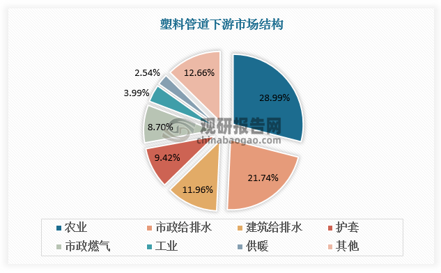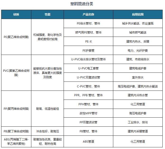 根据观研报告网发布的《中国塑料管道行业现状深度分析与未来前景研究报告(2024-2031)》显示,相比传统金属或混凝土管道,塑料管道具有耐腐蚀、寿命长、方便运输等优点,在农用、市政、建筑给排水等下游应用领域不断推广普及。
