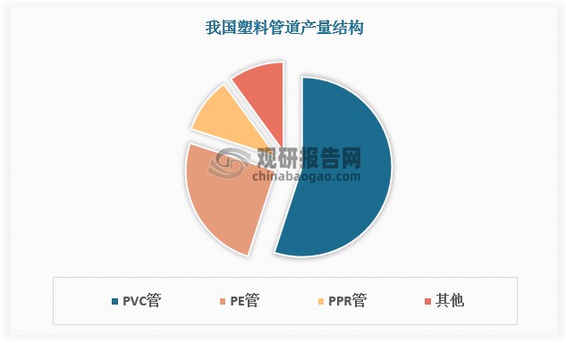 从细分市场看,目前我国塑料管道生产以PVC管为主,占比超50%左右;其次是PE管,占比25%左右。