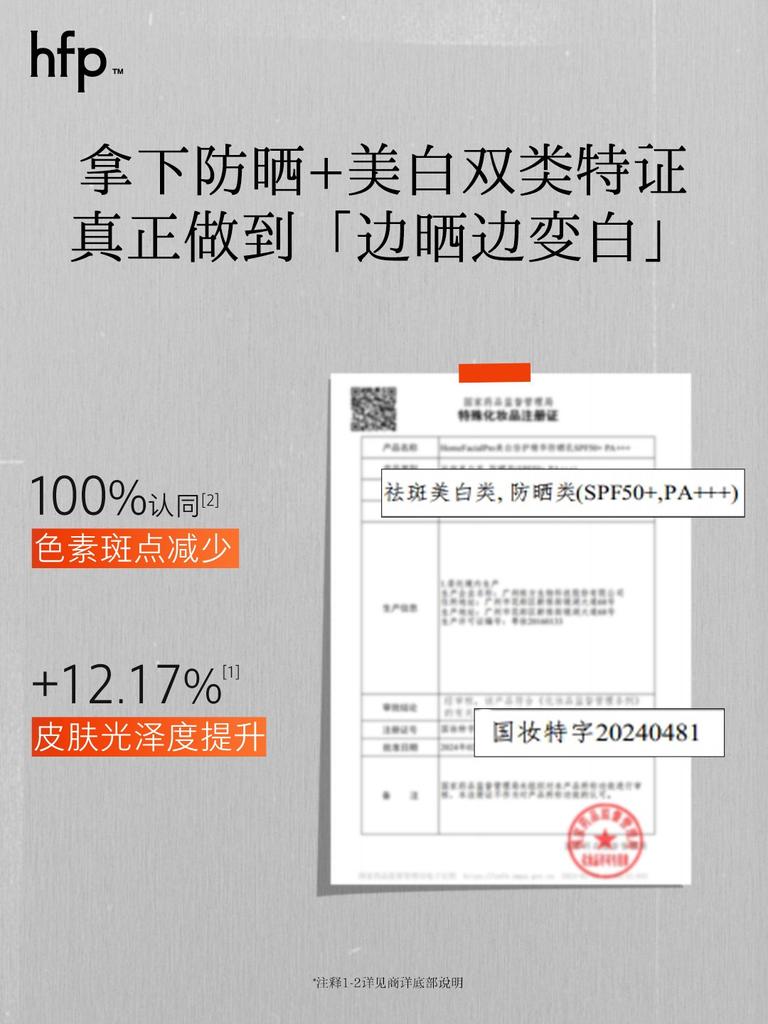 根据官方提供的第三方权威机构SGS人体功效检测报告显示,30名受试者使用hfp美白倍护精华防晒乳28天后,皮肤光泽度提升12.17%,100%自评认同色素斑点减少、上妆服帖,0人产生不良反应,可见其安全性和有效性。
