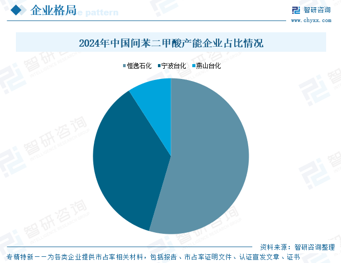 间苯二甲酸作为精细化工产品,具有技术密集、资本密集和资源密集型特征,行业整体壁垒高筑,新进入者稀少,竞争格局较为稳固。目前我国间苯二甲酸行业呈现高度集中的寡头垄断态势,生产企业数量极为有限。数据显示,2024年恒逸石化和宁波台化两家头部企业合计掌控超90%的产能供给。其中,恒逸石化以30万吨产能占全国间苯二甲酸总产能的54.55%,领跑行业;宁波台化则以20万吨产能占全国间苯二甲酸总产能的36.36%,紧随其后。