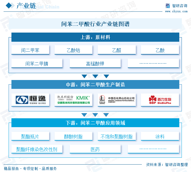 从产业链看,间苯二甲酸行业产业链上游为原材料供应环节,主要包括间二甲苯、乙酸钴、乙醛、乙酸、间苯二甲腈、高锰酸钾等。产业链中游为间苯二甲酸生产制造环节,代表厂商有燕山石化、恒逸石化、西力生物等。产业链下游为间苯二甲酸应用领域,主要包括聚酯瓶片、醇酸树脂、不饱和聚酯树脂等化工产品生产领域,以及涂料、聚酯纤维染色改性剂、医药等领域。