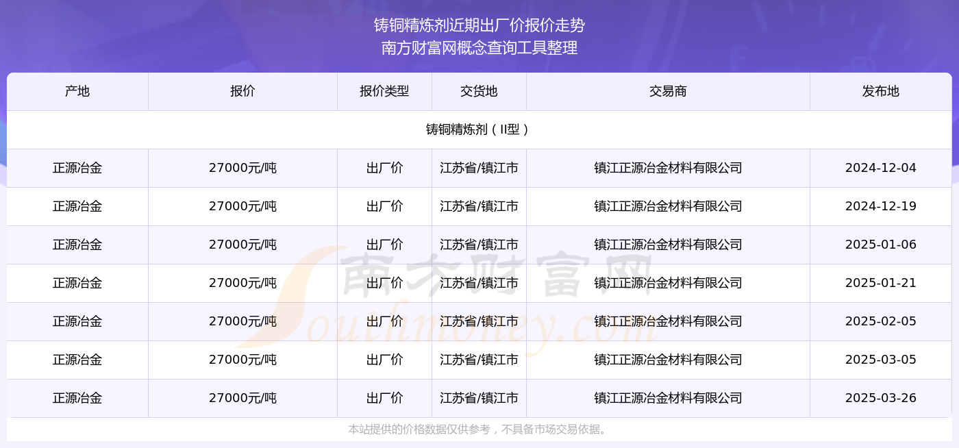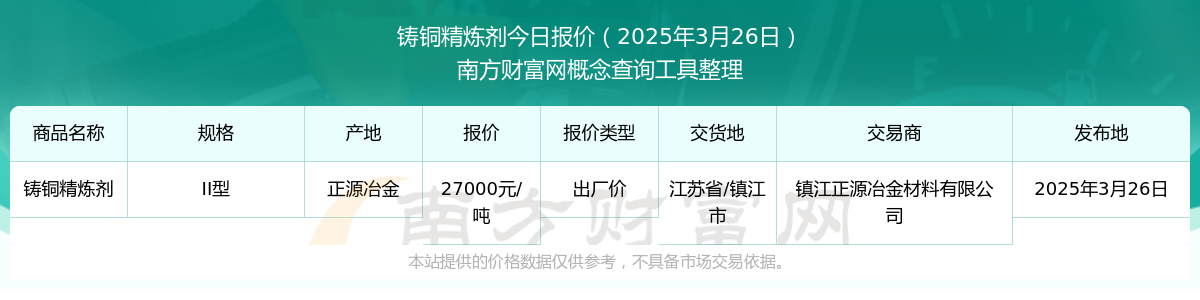 2025年3月26日,铸铜精炼剂(II型)出厂价价格为27000.00元/吨,报价人:镇江正源冶金材料有限公司,交易地点为江苏省/镇江市。